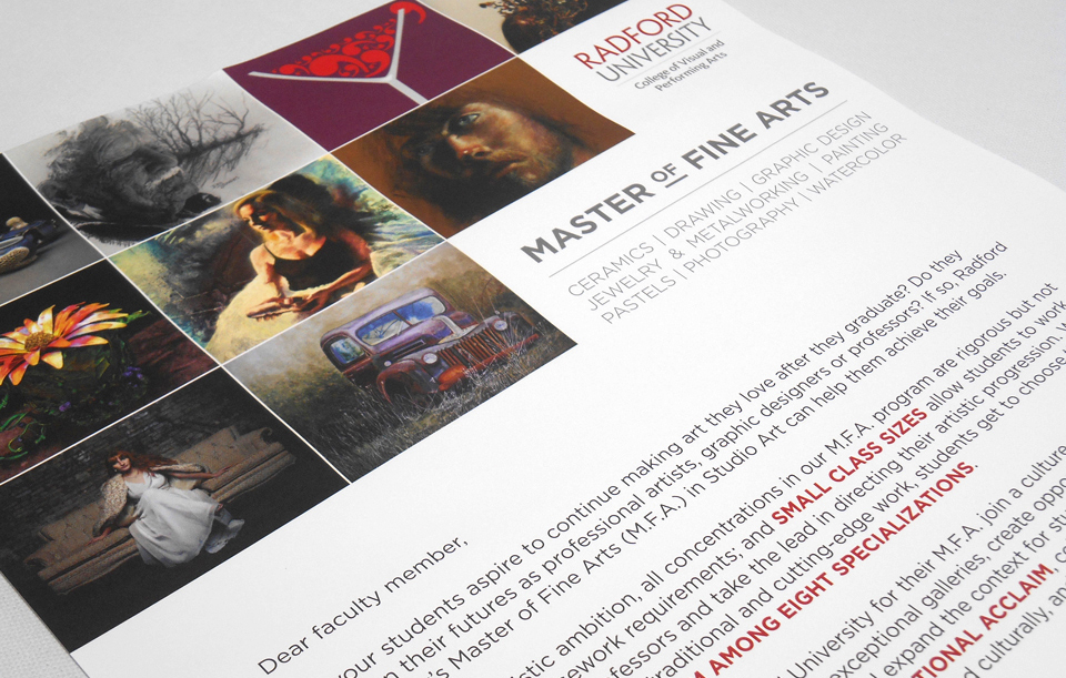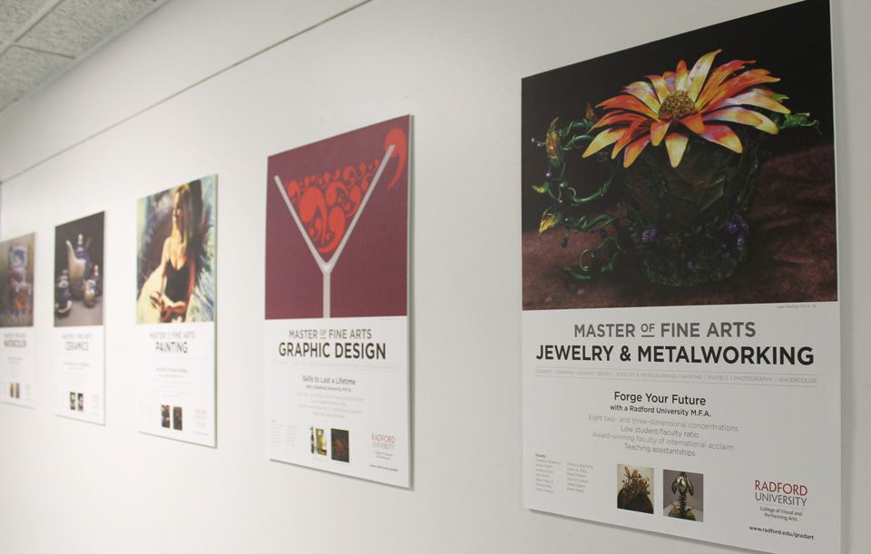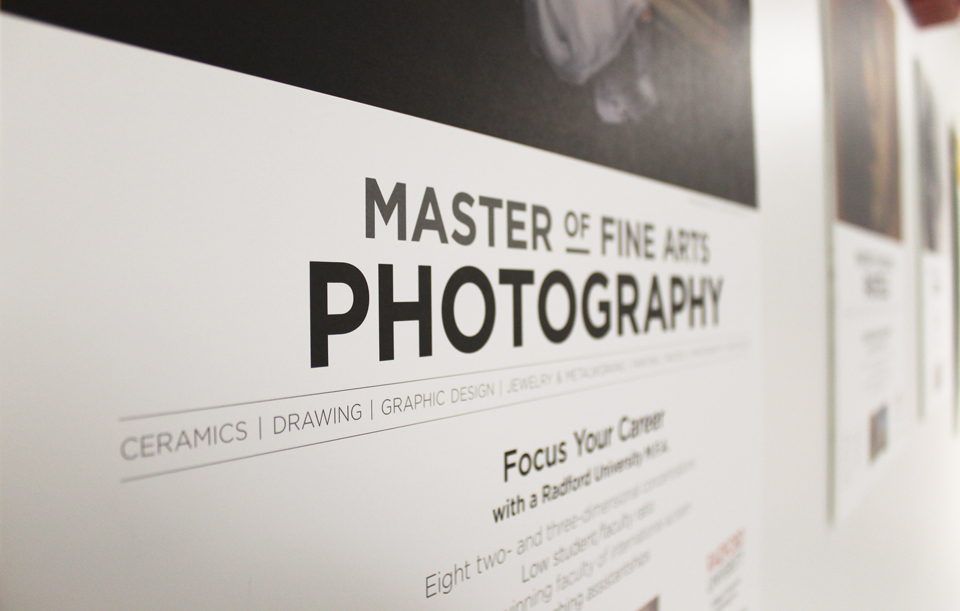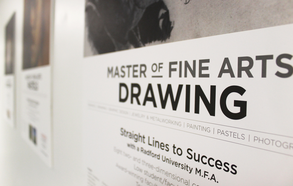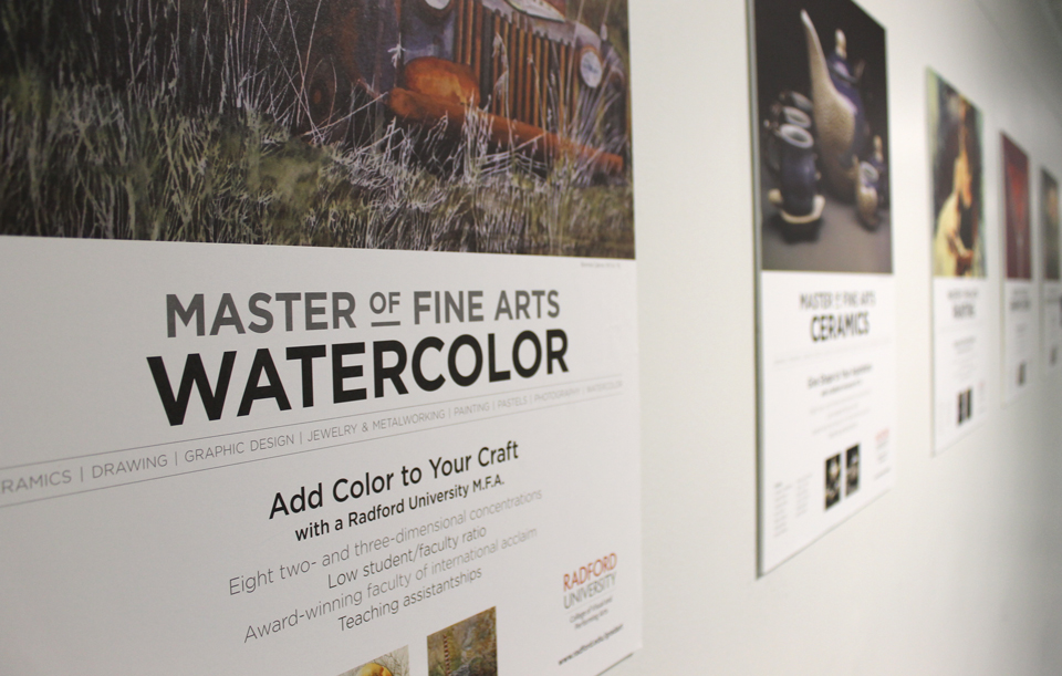 8 posters designed and mailed out as a direct mail piece in tubes to colleges, asking art professors to display them in high traffic areas in their art department to promote Radford University’s MFA program, 2015